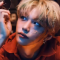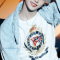 "all in" was stray kids' first japanese album. felix's hair is back to blonde but with a couple of green streaks and small braids. hes seen wearing a white graphic t-shirt with a red collar and red jacket. my favorite part of this look is the detailed fern leaf and flower on his cheek.