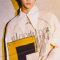 "karma" is stray kids' fourth full album. felix's main concept outfit is his signature shoulder-length middle part hairstyle in black, along with bedazzled glasses, a mummy-style bright yellow glove that is also a scarf, a louis vuitton black jacket with large shoulder pads, a bulky yellow belt, and colorful checker shorts.